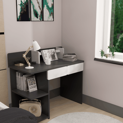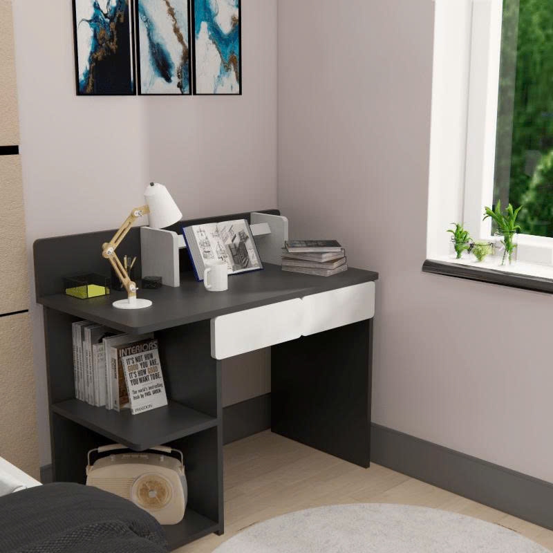 Chiếc bàn làm việc thiết kế hiện đại, nhỏ gọn phù hợp cho không gian phòng ngủ, phòng làm việc hoặc phòng học. Bàn có tông màu nâu gỗ kết hợp trắng tinh tế, tạo cảm giác sang trọng và hài hòa. Phần mặt bàn rộng rãi, đủ để đặt laptop, sách vở và các vật dụng làm việc. Phía sau mặt bàn có thanh chắn tiện dụng để tựa sách, tài liệu hoặc đồ trang trí. Bên trái bàn tích hợp kệ mở 2 tầng giúp lưu trữ sách, tạp chí, hoặc các vật dụng trang trí. Ngăn kéo phía trước với tay nắm lõm gọn gàng, mang lại sự thuận tiện trong việc cất giữ đồ cá nhân.