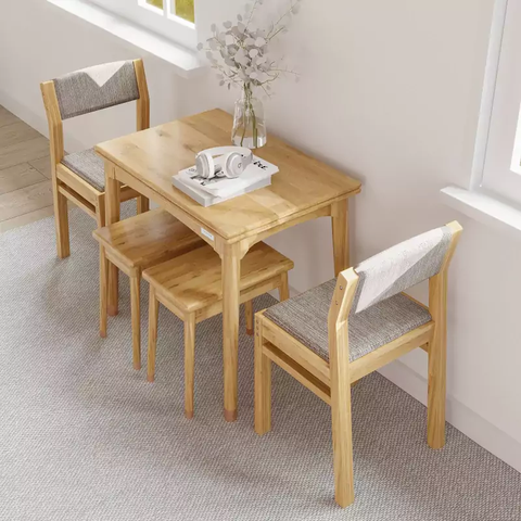 Bộ bàn ăn 4 ghế gỗ tự nhiên mang phong cách tối giản, hiện đại, phù hợp cho không gian bếp, căn hộ nhỏ hoặc gia đình ít người. Thiết kế tinh tế với các đường nét vuông vức, màu gỗ sáng tự nhiên giúp không gian trở nên ấm cúng và gần gũi hơn.