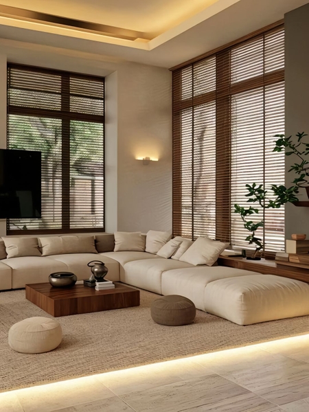 Không gian thư giãn: Bộ sofa chữ L nâu xám, thảm mềm mại và ánh sáng tự nhiên từ cửa sổ lớn mang lại sự hài hòa, ấm cúng.