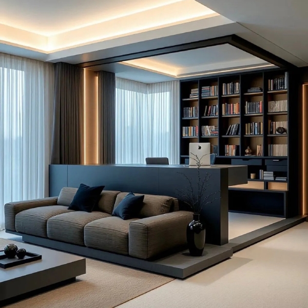 Trong cuộc sống hiện đại, ngôi nhà không chỉ để nghỉ ngơi mà còn là nơi làm việc hiệu quả. Chúng tôi mang đến thiết kế phòng khách đa năng, vừa thư giãn vừa chuyên nghiệp. Một giá sách gỗ tối màu lớn chạy dọc tường, kết hợp bàn làm việc tối giản với ghế xoay đồng bộ, tạo nên góc làm việc gọn gàng và đẳng cấp. Bên cạnh đó, bộ sofa chữ L màu nâu xám nhạt êm ái, đặt trên thảm be nhẹ, mang đến không gian thư giãn ấm cúng. Ánh sáng tự nhiên từ cửa sổ lớn hòa quyện cùng đèn LED viền trần, tạo nên một không gian hài hòa, phù hợp cho cả công việc và giải trí.