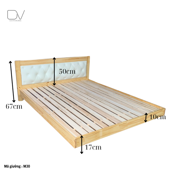 - Chất liệu: Khung giường được làm từ gỗ thông nhập khẩu 100%. Chất liệu gỗ mang đến sự ấm áp, gần gũi với thiên nhiên và độ bền cao. Phần bọc nệm đầu giường có thể là da, vải hoặc nhung.