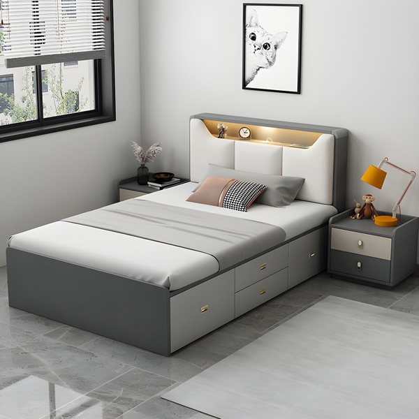- Giường có hệ thống ngăn kéo bên dưới giúp tối ưu hóa không gian lưu trữ, phù hợp với những căn phòng có diện tích nhỏ.