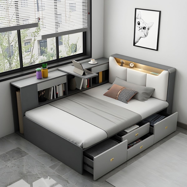 - Giường không chỉ là nơi nghỉ ngơi mà còn giúp bạn sắp xếp đồ đạc gọn gàng, tiết kiệm diện tích.