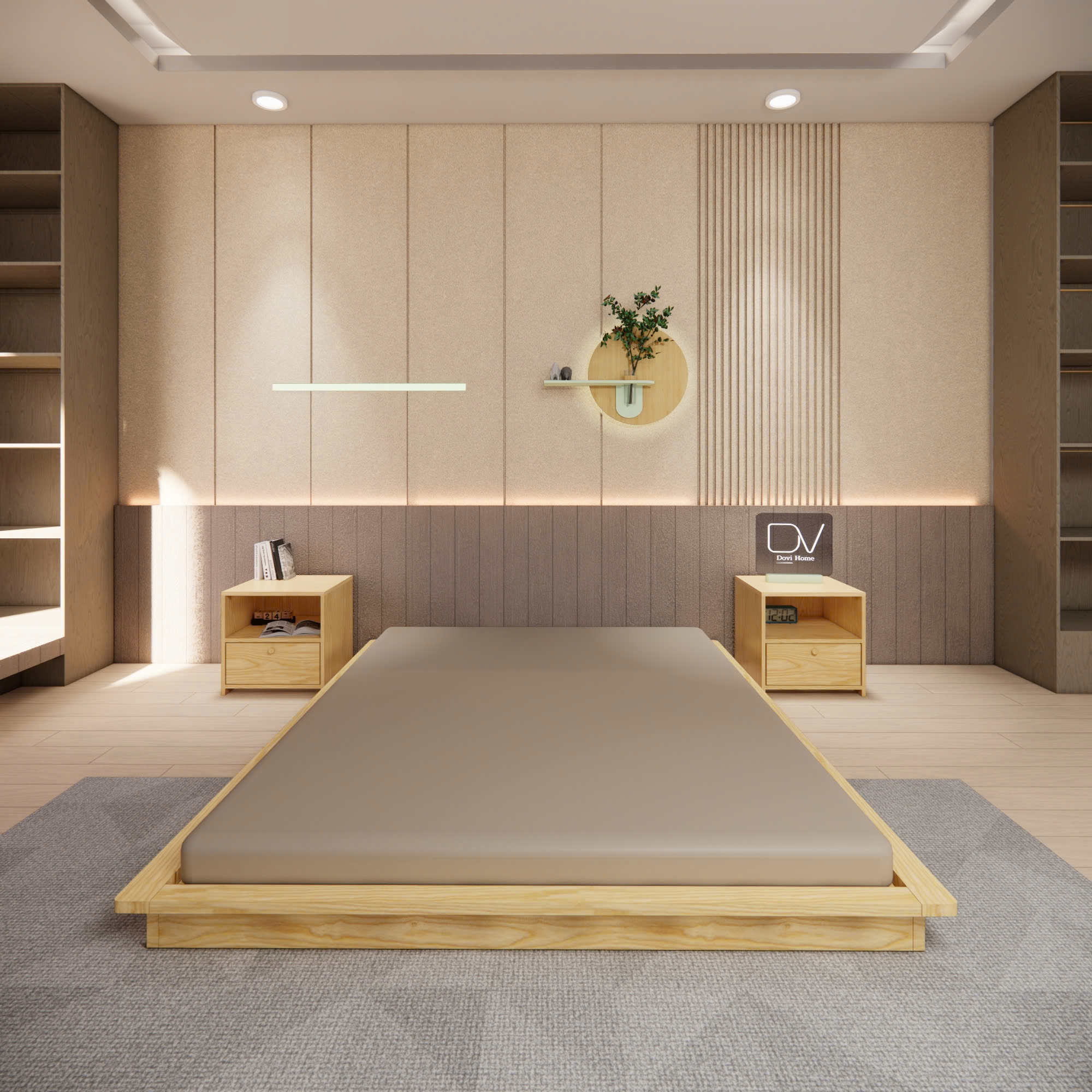 Dạng giường bệt, gần sát mặt đất, phù hợp với phong cách nội thất tối giản. Đầu giường thiết kế thanh ngang đơn giản, giúp tăng thêm sự chắc chắn và tiện dụng. Các nan gỗ đặt song song nhau, tạo khoảng cách đều, hỗ trợ lưu thông không khí tốt hơn dưới nệm.