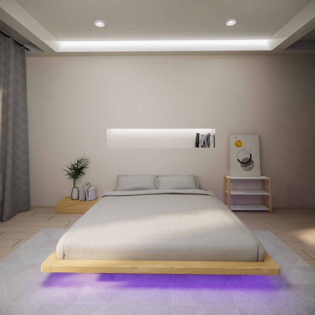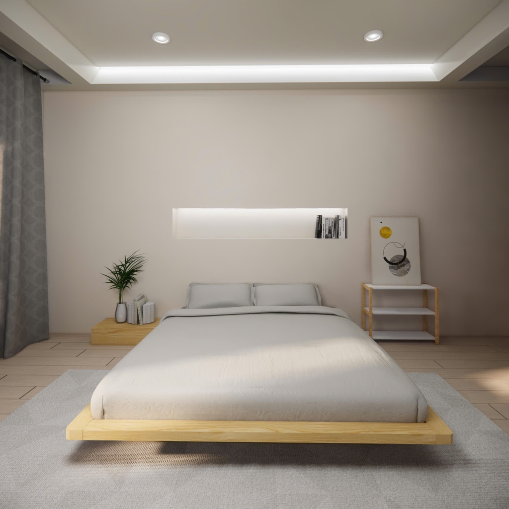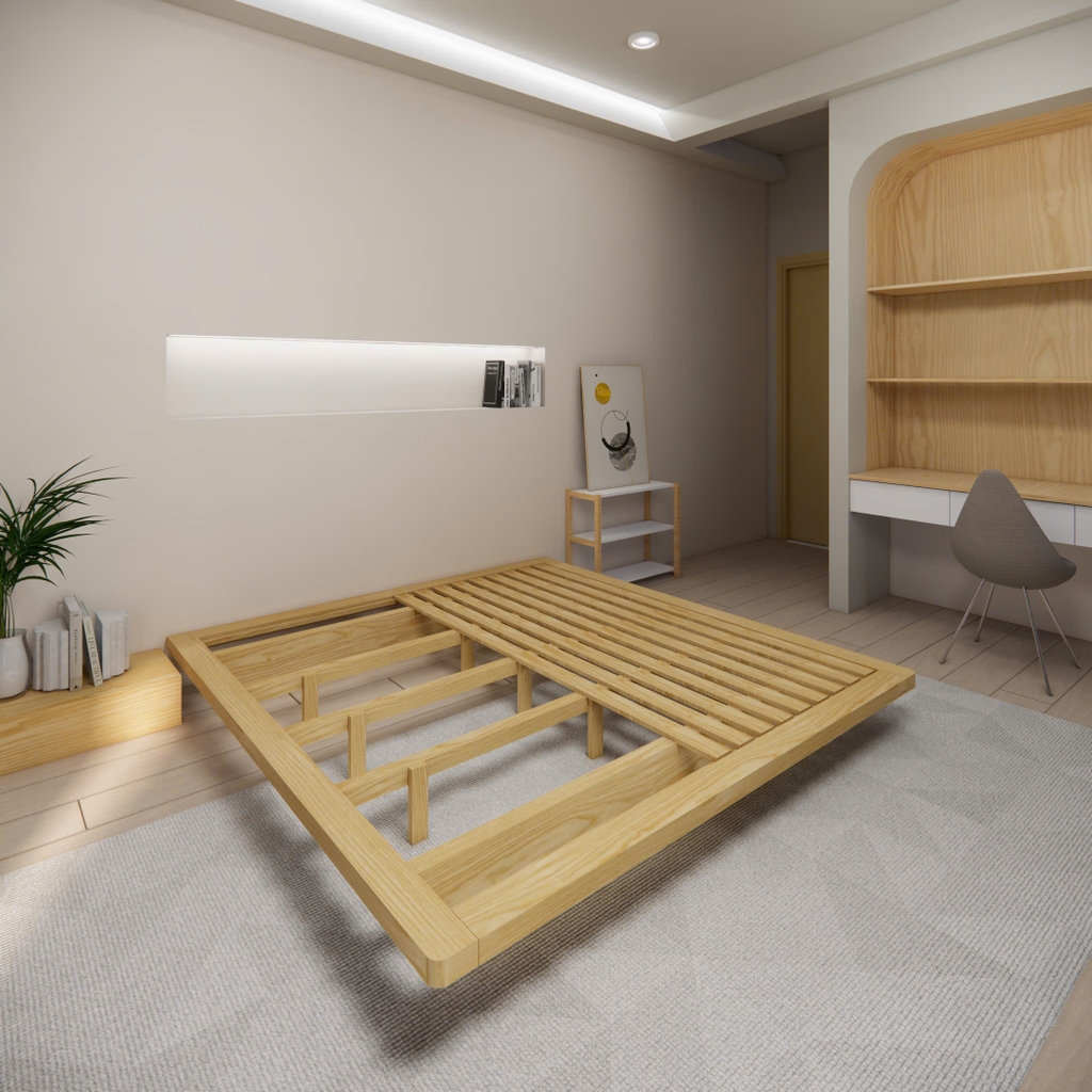 - Kiểu dáng: Giường có kiểu dáng thấp, không có chân, tạo cảm giác như đang "lơ lửng" trên không. Thiết kế này mang đến sự tinh tế, hiện đại và tối giản cho không gian phòng ngủ.