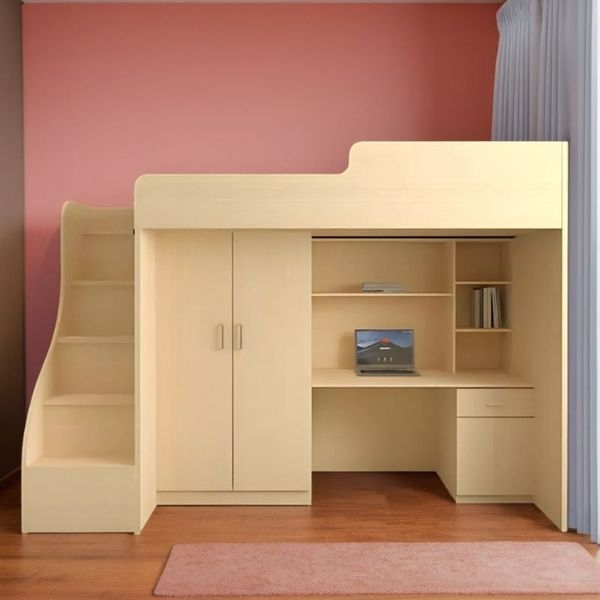 - Không gian lưu trữ tiện lợi: Giường tầng được thiết kế kết hợp với tủ quần áo, bàn học với các ngăn kéo và kệ đựng đồ, giúp bố mẹ dễ dàng sắp xếp và lưu trữ đồ đạc cho bé một cách gọn gàng.