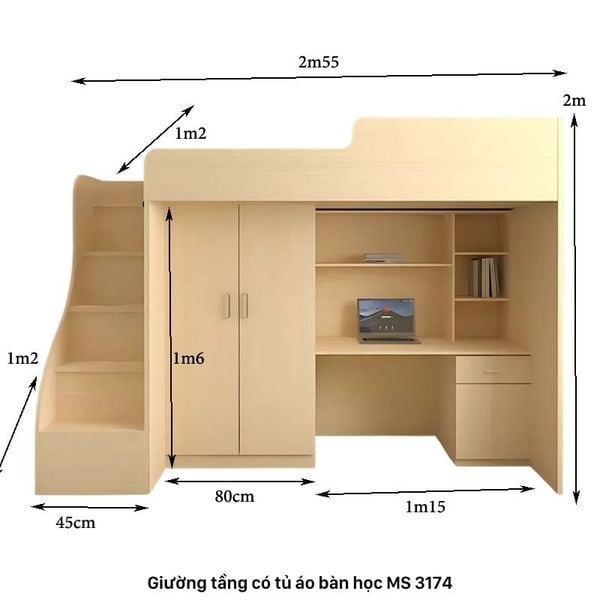Giường tầng kết hợp bàn học và tủ áo GT174 là một trong những sản phẩm nội thất thông minh được thiết kế để tối ưu hóa không gian sống, đặc biệt là trong các căn phòng có diện tích hạn chế. Với cấu trúc kết hợp giữa giường ngủ, bàn học và tủ đựng quần áo, sản phẩm này không chỉ giúp tiết kiệm diện tích mà còn tạo ra một không gian sống tiện nghi, gọn gàng và đầy đủ chức năng.