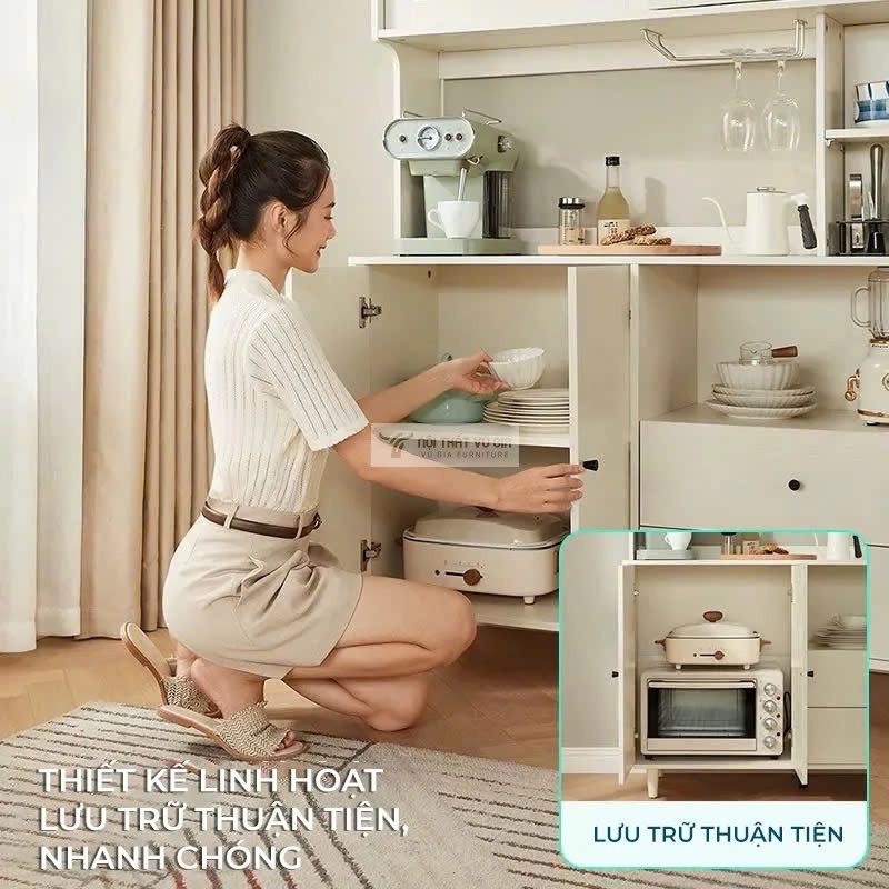 Tiện lợi khi sử dụng: Có giá treo ly, ngăn để nồi cơm điện, ấm siêu tốc, máy pha cà phê… hỗ trợ tối đa cho việc nấu nướng và pha chế.