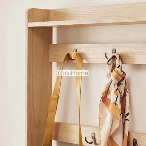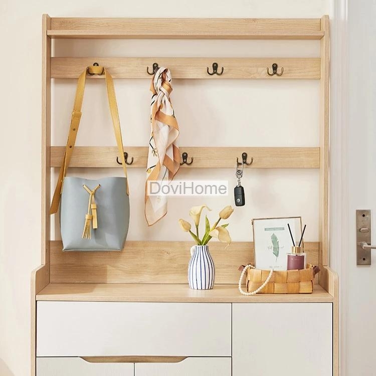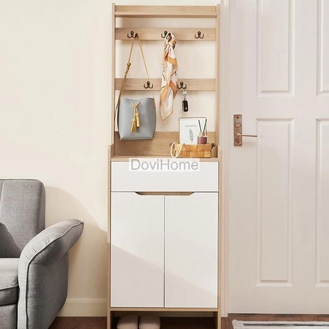 Kệ giày được thiết kế đa năng, kết hợp tủ giày, ngăn kéo tiện lợi và khu vực treo đồ ngay phía trên. Sản phẩm có kiểu dáng hiện đại, phù hợp đặt tại cửa ra vào, giúp giữ không gian luôn gọn gàng và ngăn nắp. Tủ gồm nhiều tầng để giày, cánh mở dễ sử dụng, cùng mặt bàn trên rộng có thể dặt lọ hoa, chìa khóa hoặc vật dụng cá nhân. Kệ phía trên tích hợp nhiều móc treo chắc chắn, tiện để túi sách, khăn choàng, chìa khóa hoặc áo khóa nhẹ