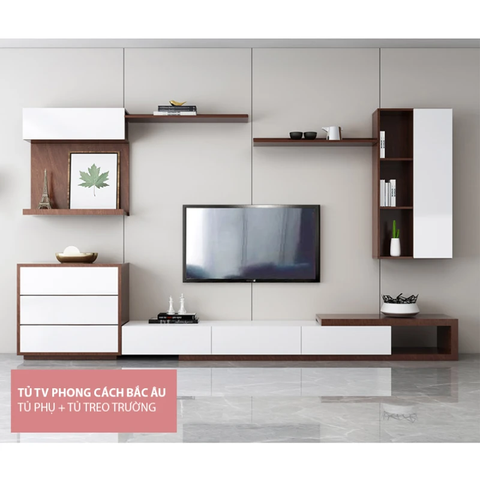 Kệ tivi trong hình mang phong cách hiện đại, tối giản nhưng vẫn đảm bảo tính tiện nghi và sang trọng cho không gian phòng khách. Thiết kế kết hợp hài hòa giữa màu trắng tinh tế và màu vân gỗ tự nhiên, tạo điểm nhấn nổi bật, dễ dàng phối hợp với nhiều phong cách nội thất khác nhau.