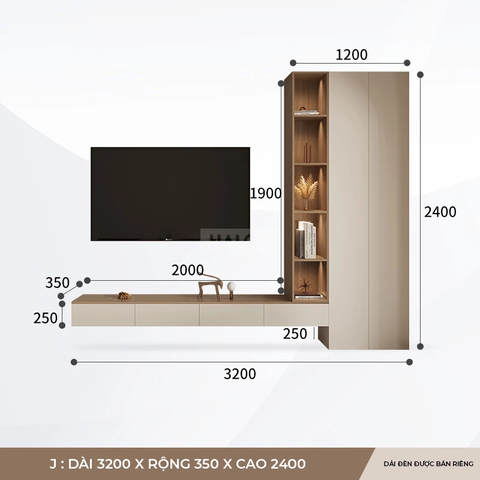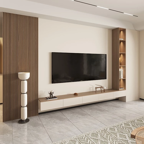 Kệ tivi thiết kế hiện đại, tối giản với kệ dài âm tường kết hợp tủ trang trí đứng có đèn led, tông màu gỗ, kem mang đến sự sang trọng và hài hòa cho phòng khách