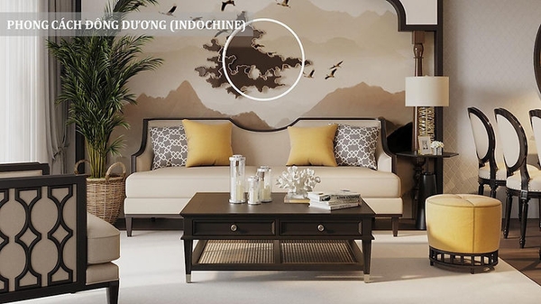 - Đông Dương là sự hòa trộn giữa kiến trúc Pháp cổ và văn hóa Á Đông tạo nên vẻ đẹp hoài cổ nhưng sang trọng. Không gian thường dùng màu vàng đất - nâu - xanh rêu - cam đất kết hợp các vật liệu như gỗ tự nhiên, gạch bông, mây tre vừa mang tính thẩm mỹ vừa giữ giá truyền thống. Họa tiết đặc trưng thường thấy là hoa sen, họa tiết Đông Sơn, vòm cong, tạo dấu ấn nghệ thuật đậm nét văn hóa Việt Nam. Phù hợp biệt thự, resort, nhà phong cách cổ điển Á Đông
