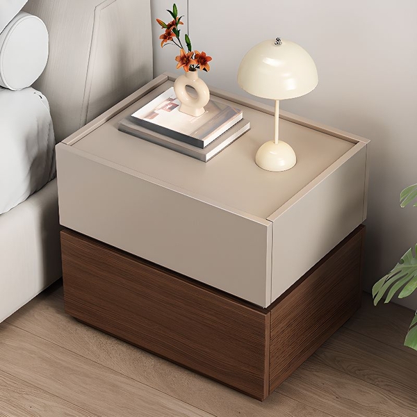 - Tab đầu giường có thiết kế hiện đại, tối giản nhưng sang trọng. Sự kết hợp giữa hai tông màu – phần trên màu be sáng và phần dưới màu gỗ nâu – mang đến vẻ ngoài tinh tế, phù hợp với nhiều phong cách nội thất khác nhau.