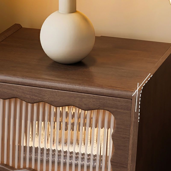 Chiếc tủ đầu giường này được thiết kế theo phong cách hiện đại tối giản, với tông màu gỗ nâu ấm áp, tạo nên sự sang trọng và ấm cúng cho không gian phòng ngủ. Phần mặt trước nổi bật với một cánh tủ bằng kính sọc mờ kết hợp khung viền lượn sóng tinh tế, giúp tạo điểm nhấn độc đáo và nghệ thuật. Tủ bao gồm một ngăn kéo phía dưới và một ngăn tủ phía trên có cánh mở trong suốt, giúp bạn dễ dàng cất giữ và quan sát các vật dụng bên trong.
