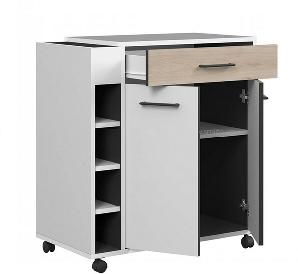 Tủ bếp đa năng thiết kế hiện đại, nhỏ gọn nhưng đầy đủ công năng, là lựa chọn lý tưởng cho những căn bếp có diện tích hạn chế hoặc người dùng yêu thích sự linh hoạt. Tủ gồm 1 ngăn kéo lớn tiện lợi để đựng dụng cụ bếp, 2 cánh tủ dưới giúp lưu trữ nồi, chảo hoặc các vật dụng lớn. Bên hông tích hợp hệ kệ đứng nhiều tầng, thích hợp để gia vị, chai lọ hoặc các vật dụng nhỏ gọn khác. Thiết kế 4 bánh xe linh hoạt giúp dễ dàng di chuyển mà không cần tốn nhiều sức.