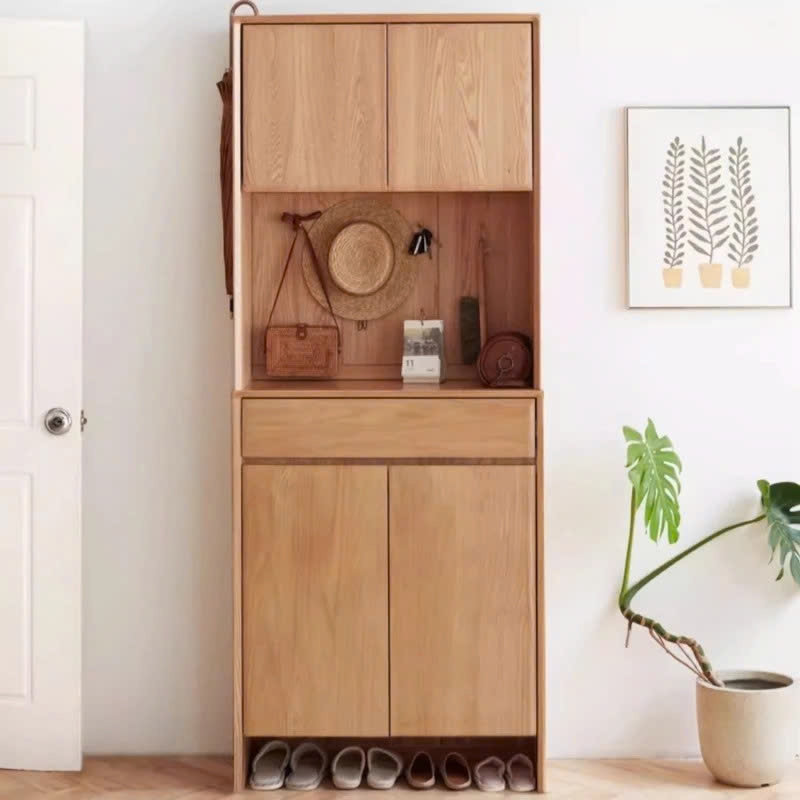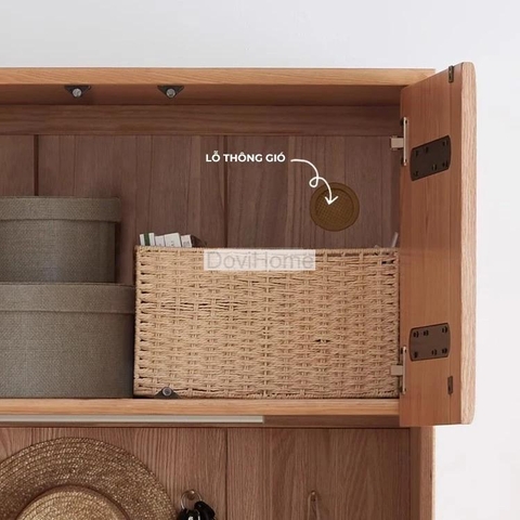 Kệ giày gỗ thiết kế tối giản, gồm tủ trên, ngăn treo đồ ở giữa và tủ giày phía dưới. Có thêm ngăn hở để dép tiện lợi. Kiểu dáng thanh lịch, phù hợp đặ ở sảnh cửa giúp giữ không gian luôn gọn gàng, và sang trọng