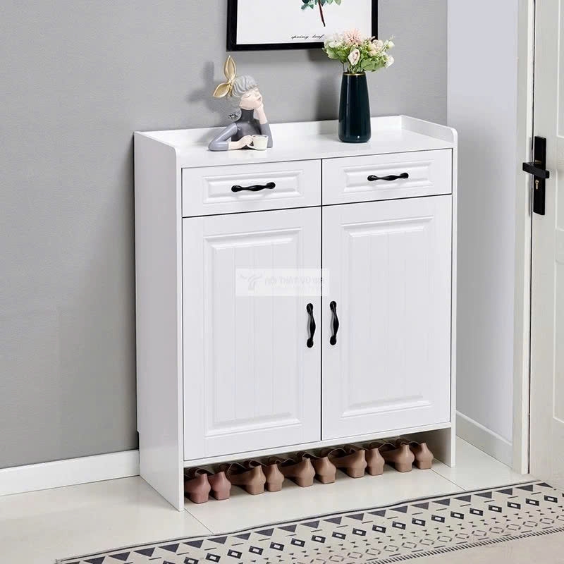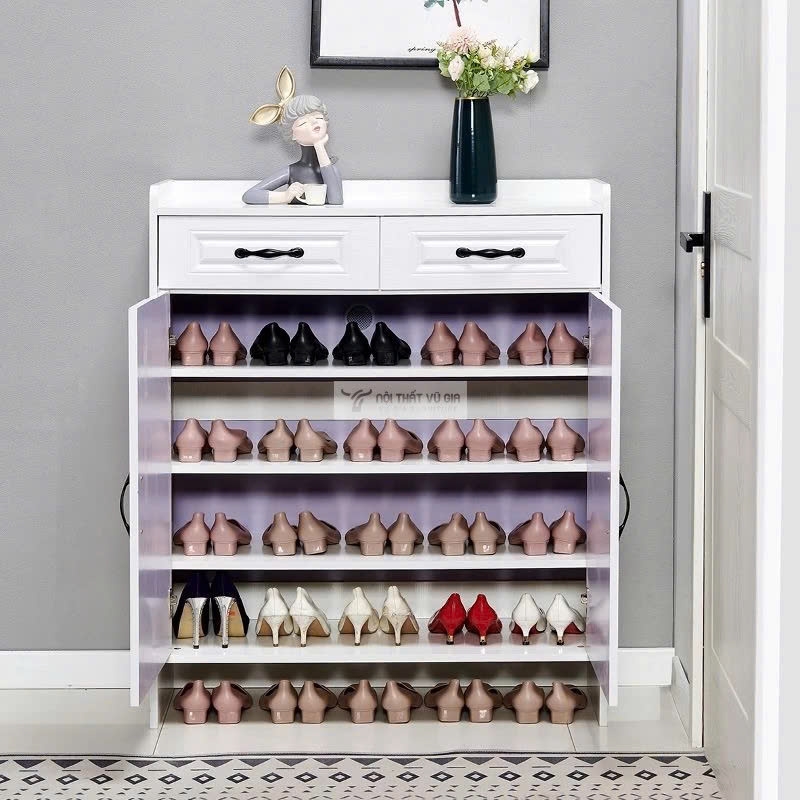 Cấu trúc thông minh, tối ưu công năng: Gồm 2 ngăn kéo nhỏ phía trên và 2 cánh cửa lớn bên dưới, giúp phân loại giày dép và vật dụng cá nhân khoa học, dễ tìm và dễ lấy.