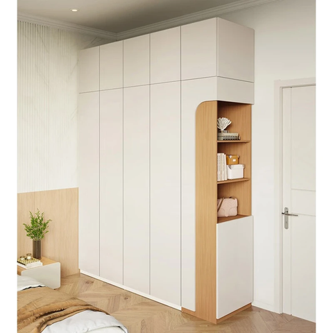 Tối ưu không gian lưu trữ: Kiểu dáng tủ cao chạm trần giúp tận dụng tối đa diện tích, mang lại sức chứa lớn cho quần áo, chăn gối, vali và các vật dụng cá nhân.