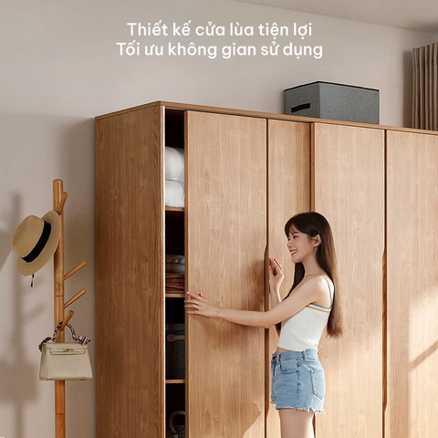 Thiết kế gồm 3 cánh tủ chính rộng rãi kết hợp với ngăn tủ trên giúp tối ưu không gian lưu trữ. Bên trong tủ được bố trí khoa học: có khoang treo quần áo, khoang gấp gọn, và các ngăn phụ tiện lợi để đựng chăn ga, vali hay phụ kiện. Tay nắm tủ được thiết kế âm, tạo đường nét gọn gàng, an toàn và dễ sử dụng.