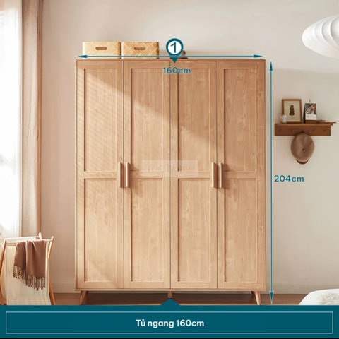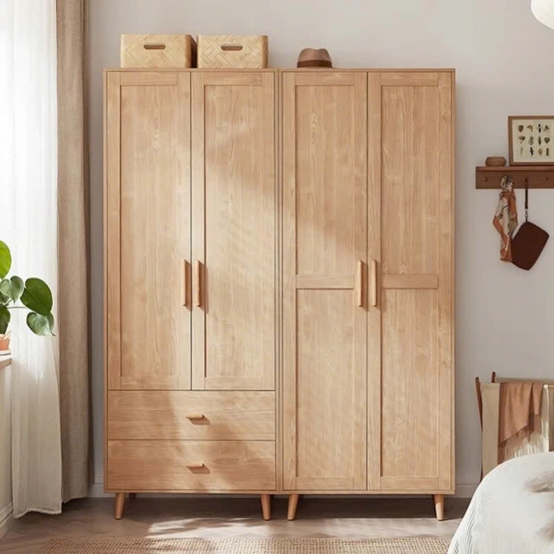 Tủ Quần Áo Gỗ Tự Nhiên 4 Cánh 2 Hộc Kéo Phong Cách Bắc Âu Hiện Đại