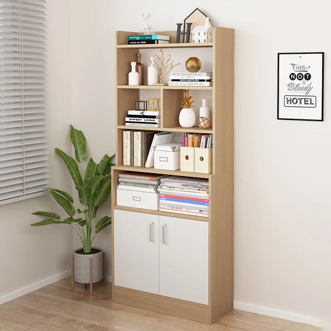 Tủ sách kết hợp tủ đồ thiết kế hiện đại, gồm nhiều ngăn kệ mở tiện trưng bày sách, đồ trang trí và vật dụng cá nhân. Phần tủ dưới có cánh đóng kín giúp lưu trữ gọn gàng, giữ không gian sạch đẹp và tinh tế.